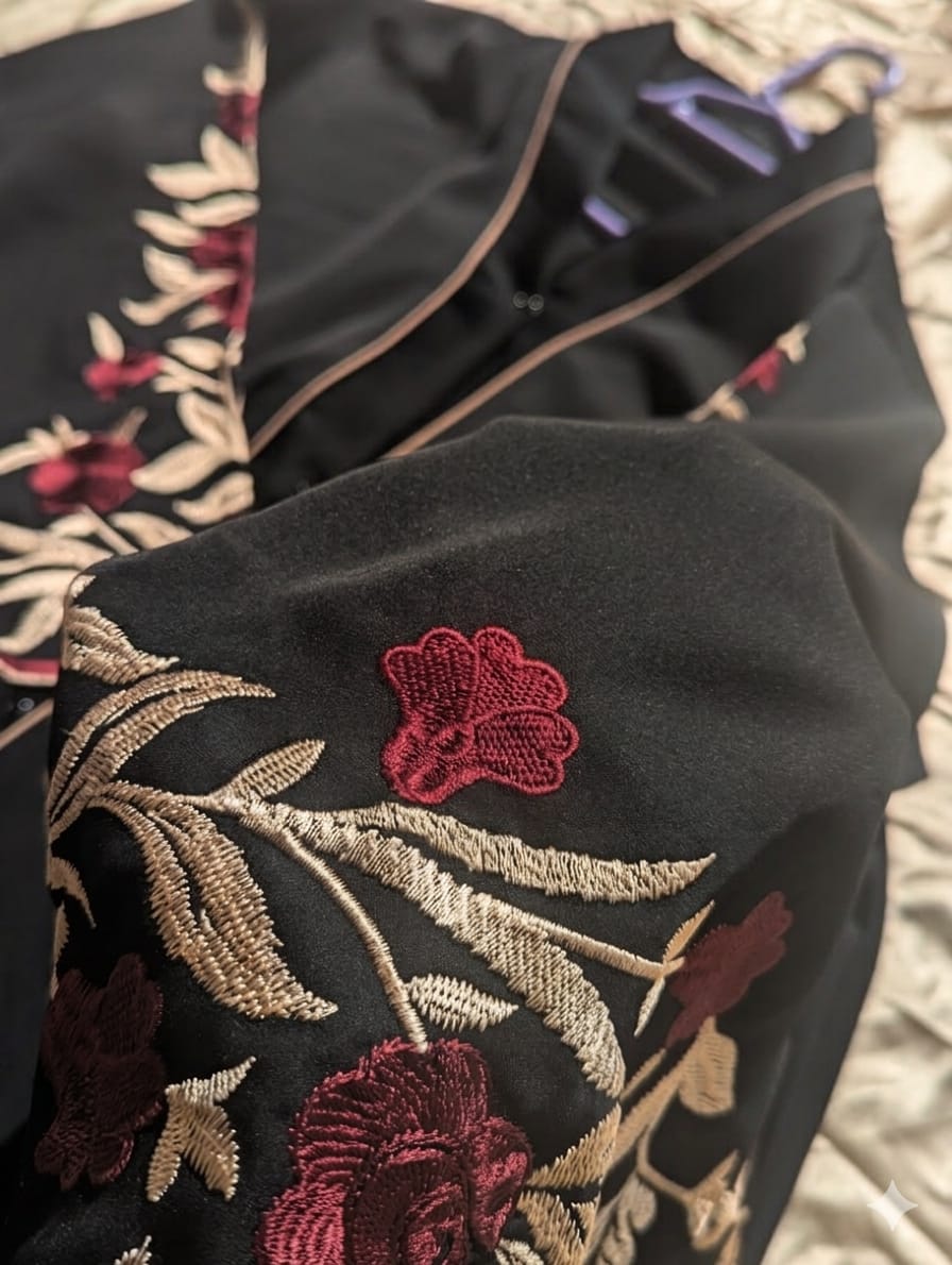 Elevate your wardrobe with this elegant black abaya, featuring intricate maroon embroidery on the sleeves. Delicate floral branches in soft cream add a subtle contrast, creating a perfect balance of sophistication and charm. Ideal for both formal gatherings and special occasions, this abaya is a timeless statement piece.